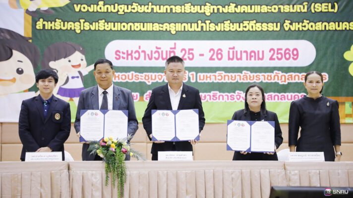 วันที่ 25 มีนาคม 2569 สำนักงานศึกษาธิการจังหวัดสกลนคร จัดอบรมการพัฒนาครูปฐมวัยเพื่อส่งเสริมสุขภาวะที่ดี (Well-being) ของเด็กปฐมวัย ผ่านการเรียนรู้ทางสังคมและอารมณ์ (SEL) สำหรับครูโรงเรียนเอกชนจังหวัดสกลนคร โดยมี ผศ.ชาคริต ชาญชิตปรีชา อธิการบดีมหาวิทยาลัยราชภัฏสกลนคร กล่าวต้อนรับผู้เข้าร่วมอบรม และ นายเอกชัย ใจก๋องแก้ว รองศึกษาธิการจังหวัดสกลนคร เป็นประธานกล่าวเปิดการอบรม นางอรุณรุ่ง โยธสิงห์ ผู้อำนวยการกลุ่มนิเทศติดตามและประเมินผล กล่าวรายงาน พร้อมด้วยผู้บริหารสถานศึกษา ครูแกนนำโรงเรียนวิถีธรรมฯ ครูปฐมวัยจากโรงเรียนเอกชน จำนวน 120 คน เข้าร่วมการอบรมเพื่อให้ครูมีความรู้และเข้าใจใน แนวคิด Well-being ดำเนินการอบรมระหว่างวันที่ 25-26 มีนาคม 2569 ณ หอประชุมจามจุรี 1 มหาวิทยาลัยราชภัฏสกลนคร